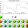 该图绘制了第二和第三行氢化物化合物中的键强度,通常在整个周期表中增加,最强键出现在惰性气体之前的元素中。该图的两行整体形状相似,但第三行的值更高,这是由于填充的第二个壳对细胞核提供了额外的屏蔽。图像显示了映射到等密度表面上的每种化合物的静电势。H2表面说明了这种键的共价性质;其他氢化物化合物中的键是离子键。负静电势(红色)位于每行开头的氢原子上,随着行内原子序数的增加,它移动到取代基上。因此,由于电负性的变化,氢化物键强度在一个周期(行)中增加,并随着您向下一个组(列)而减少。